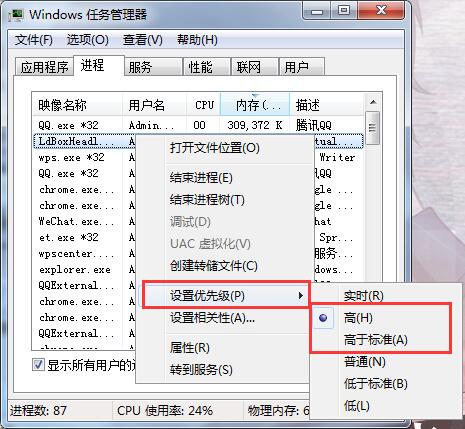 点击右键-设置优先级-设置为“高”或“高于标准”: