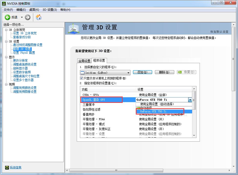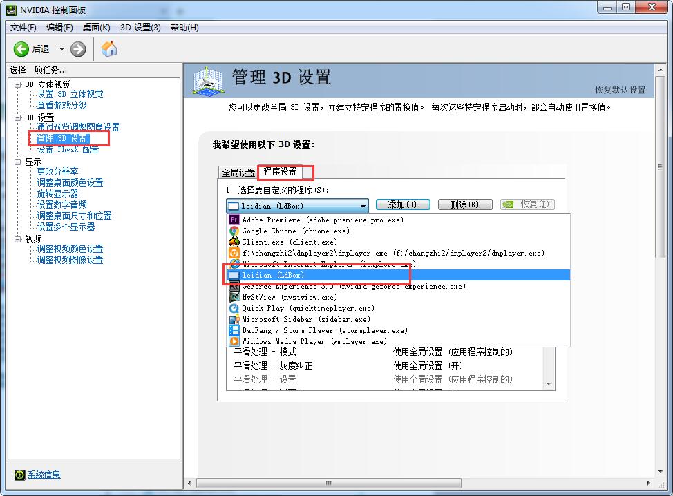 点击左侧“管理3D设置”,在右侧“程序设置”栏目选择“Leidian(Ldbox)”