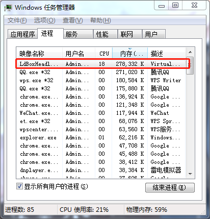 打开任务管理器(电脑最下方工具栏右键唤出),选择进程-LdBox项目: