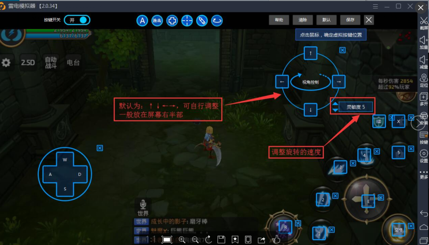 进入游戏战斗画面,会显示技能按键。然后点击模拟器右侧功能列表里的虚拟按键功能。可以更改成自己惯用的按键。 点右上角的“默认”按钮,就会还原默认的设置。