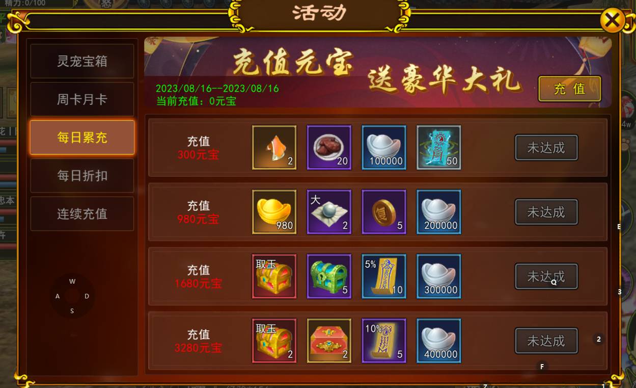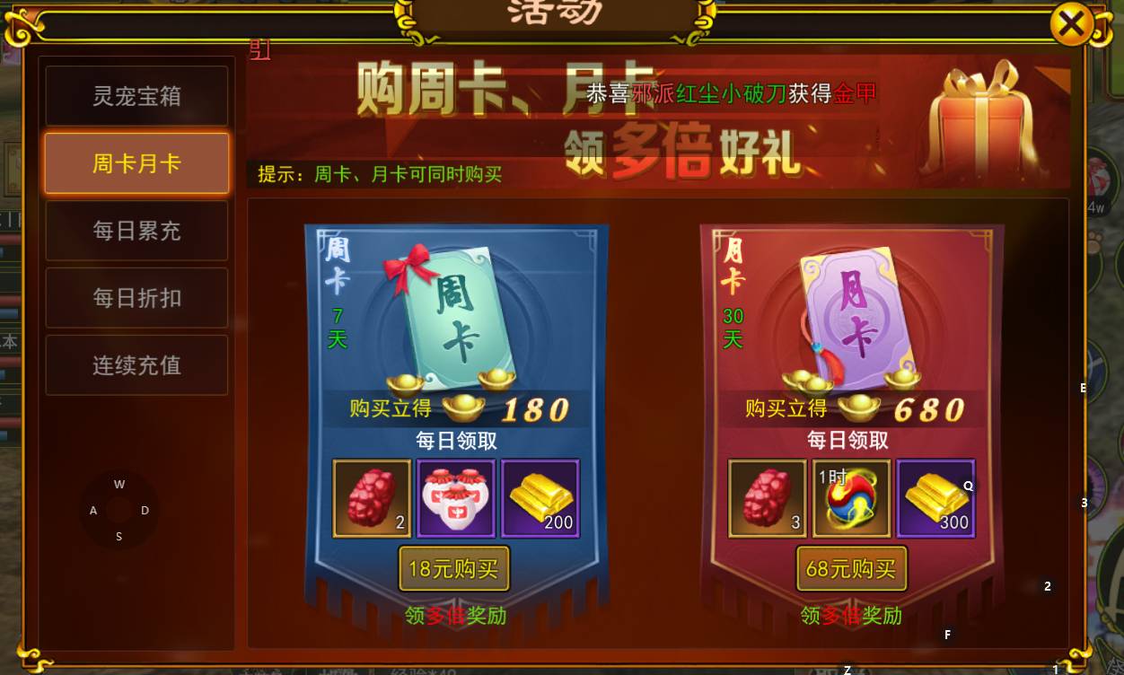 第二天只需要充值月卡、周卡在获得元宝氪金最大化的前提下还能获得后期的材料储备一箭双雕。这个时候利益还没到最大化,可以在充值12元,可以在去活动处领取充值980的元宝活动。这样总计1960的元宝到手。