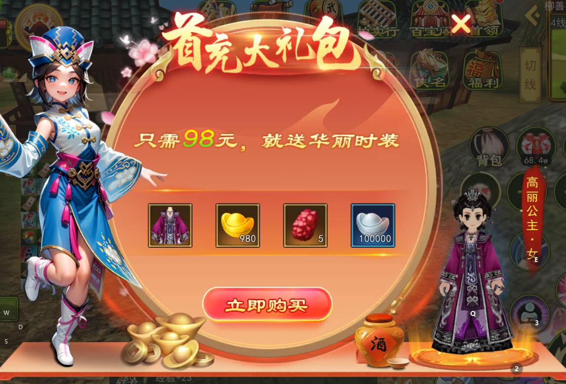 然后充值一个首充30的可以在活动中领取一个980的元宝,加上充值获得的300元宝总计1280元宝。