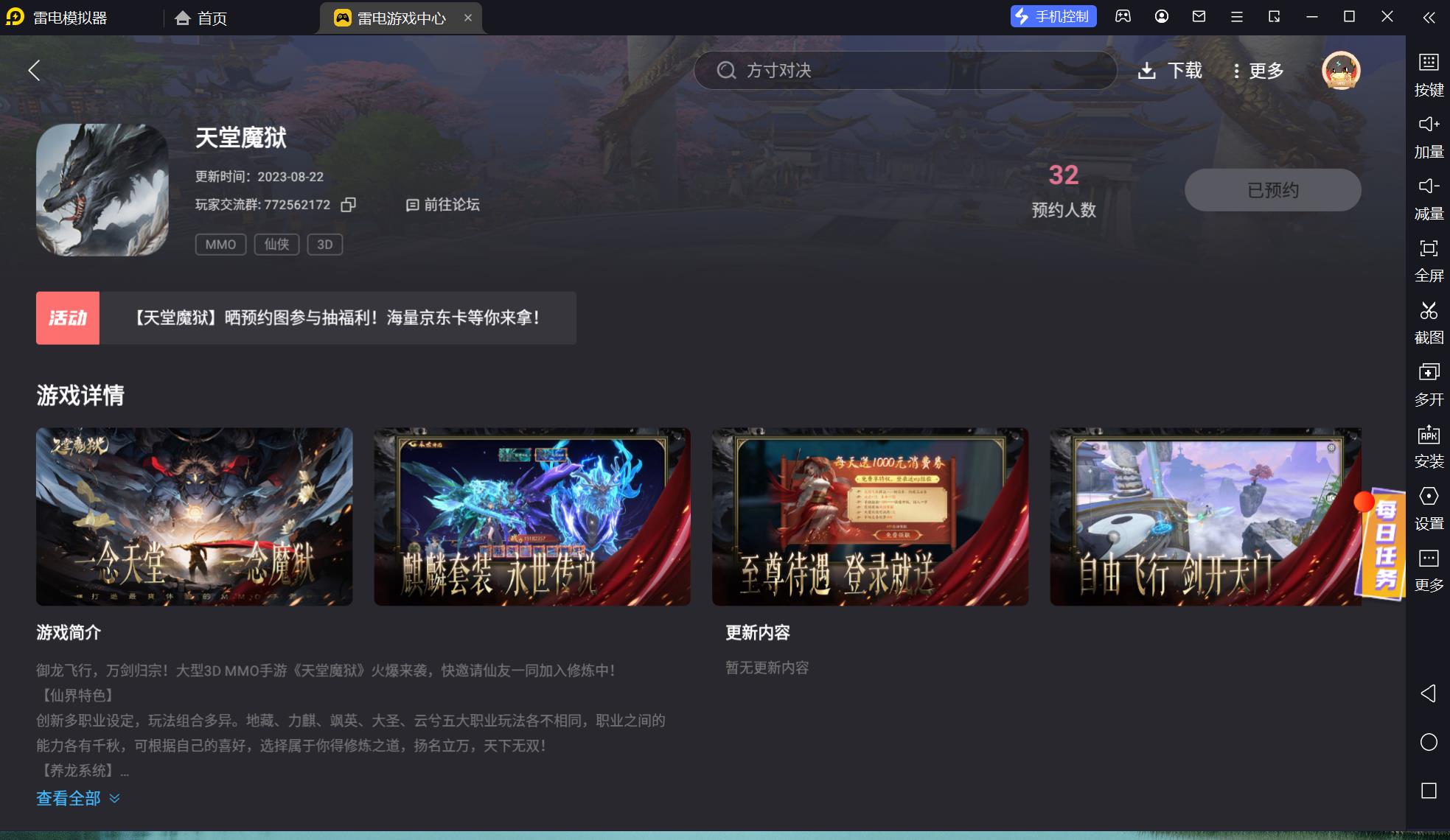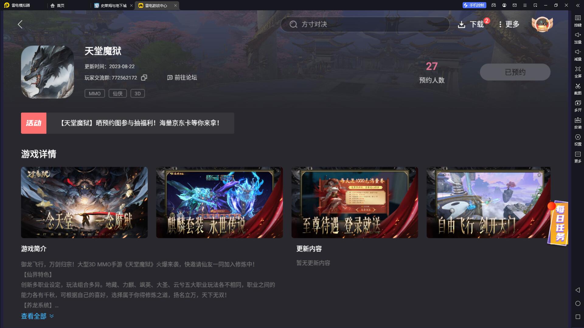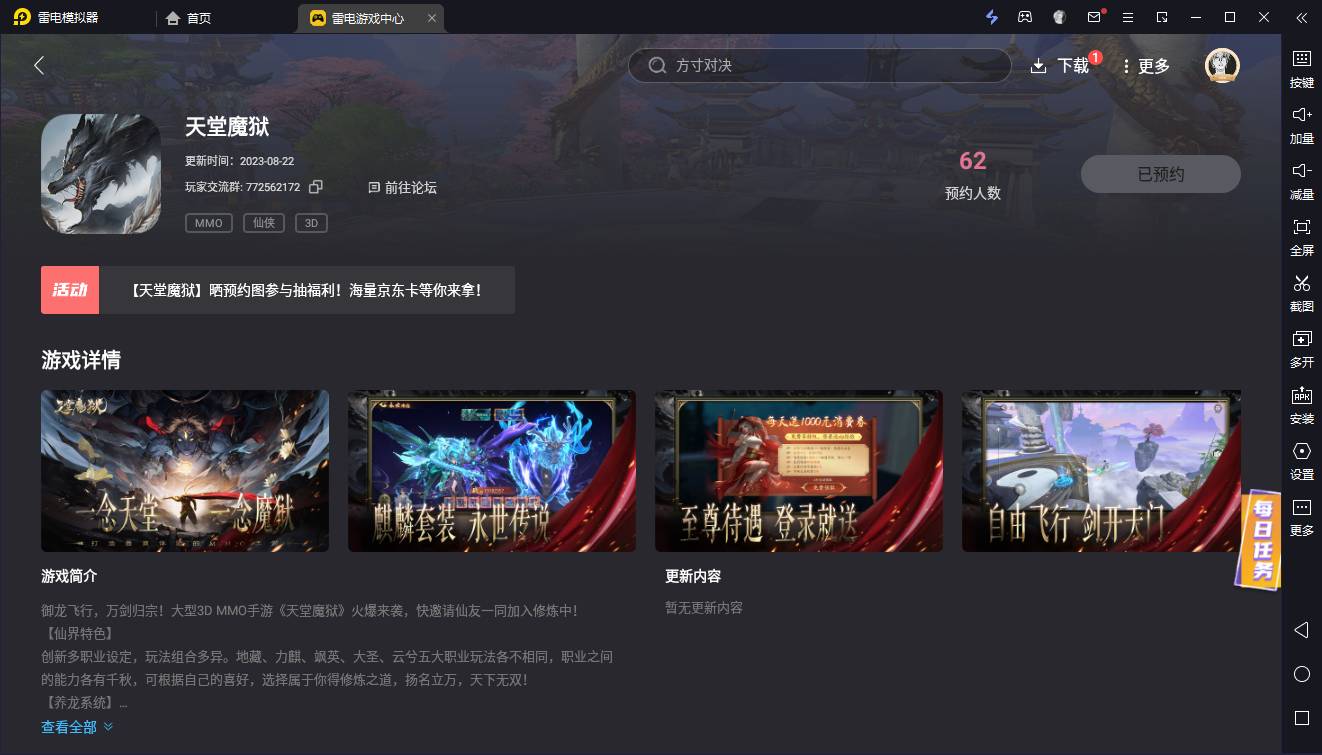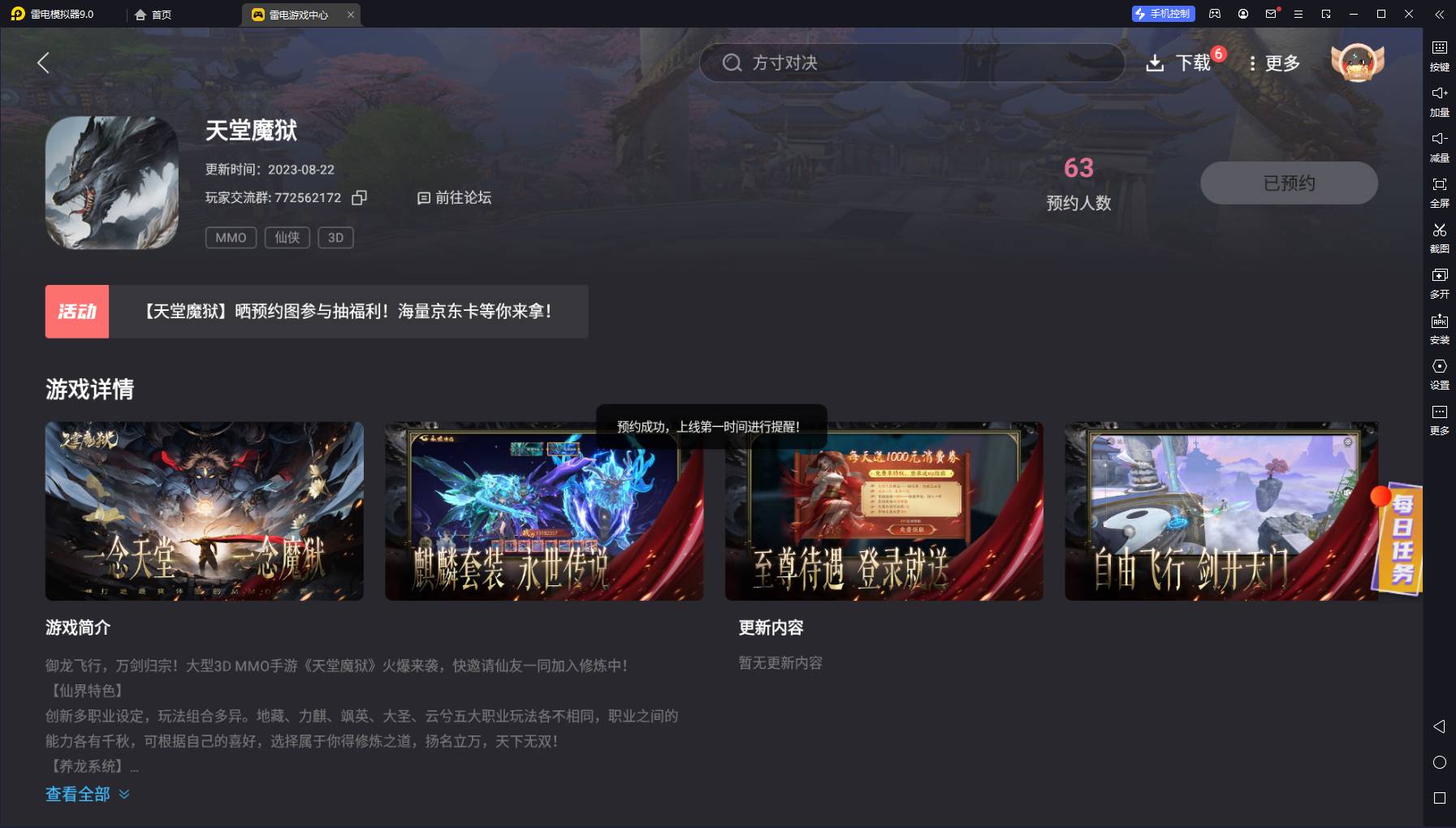 1、从雷电游戏中心/雷电圈app进入【天堂魔狱】页面,点击预约;