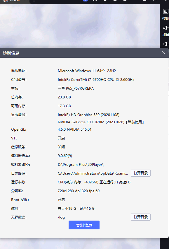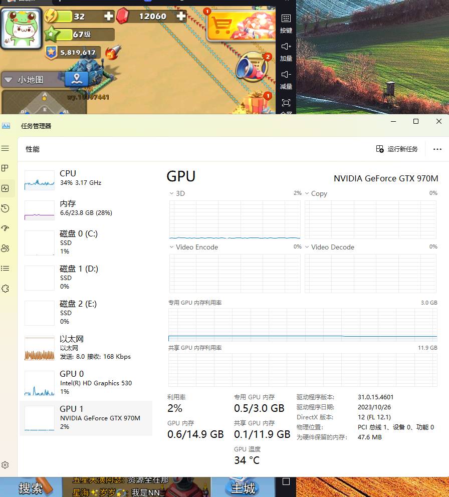 从任务管理器中看出来雷电9使用了**显卡的资源只有2%-3%使用率,但是雷电9中的游戏却特别卡。
