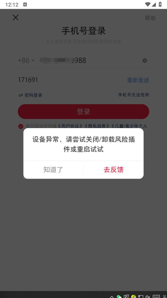 3、登陆使用界面显示(设备异常,请尝试关闭/卸载风险插件或重启试试)