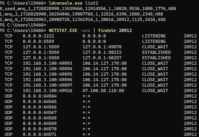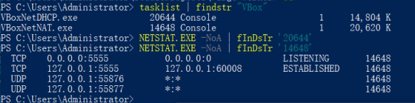 而新的模拟器不能通过这种方式获取到端口号,并且会多出VirtualBox DHCP ******和VirtualBox NAT Engine进程。通过VBoxNetNAT.exe进程号反倒可以查询到端口号。