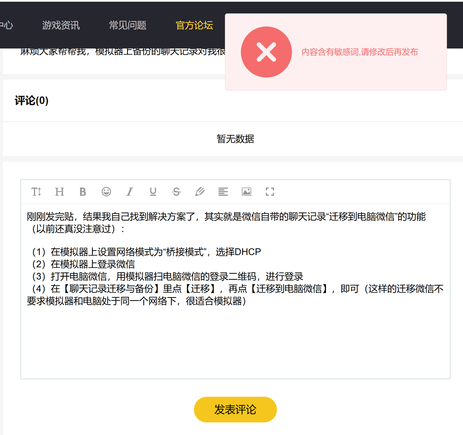 结果现在想要把微信聊天记录从模拟器备份回手机(手机微信卸载重装了)的时候,发现模拟器和手机不在同一个wifi下(手机备份到模拟器的时候没有报这个错误,不知为何),没法把聊天记录恢复到手机里。