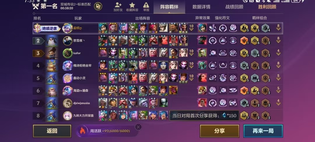 4-5回合之后给五伏击爆爆突变升级四星,伤害更上一层楼,根据五家人补充的转职和装备,开出了5家人5伏击4搏击4监察的**多拼羁绊,我们也是稳步连胜,在最后几个回合对战6征服者时,我们根据最后调整站位,让对面控制没对到我们的爆爆,最终完成吃鸡。