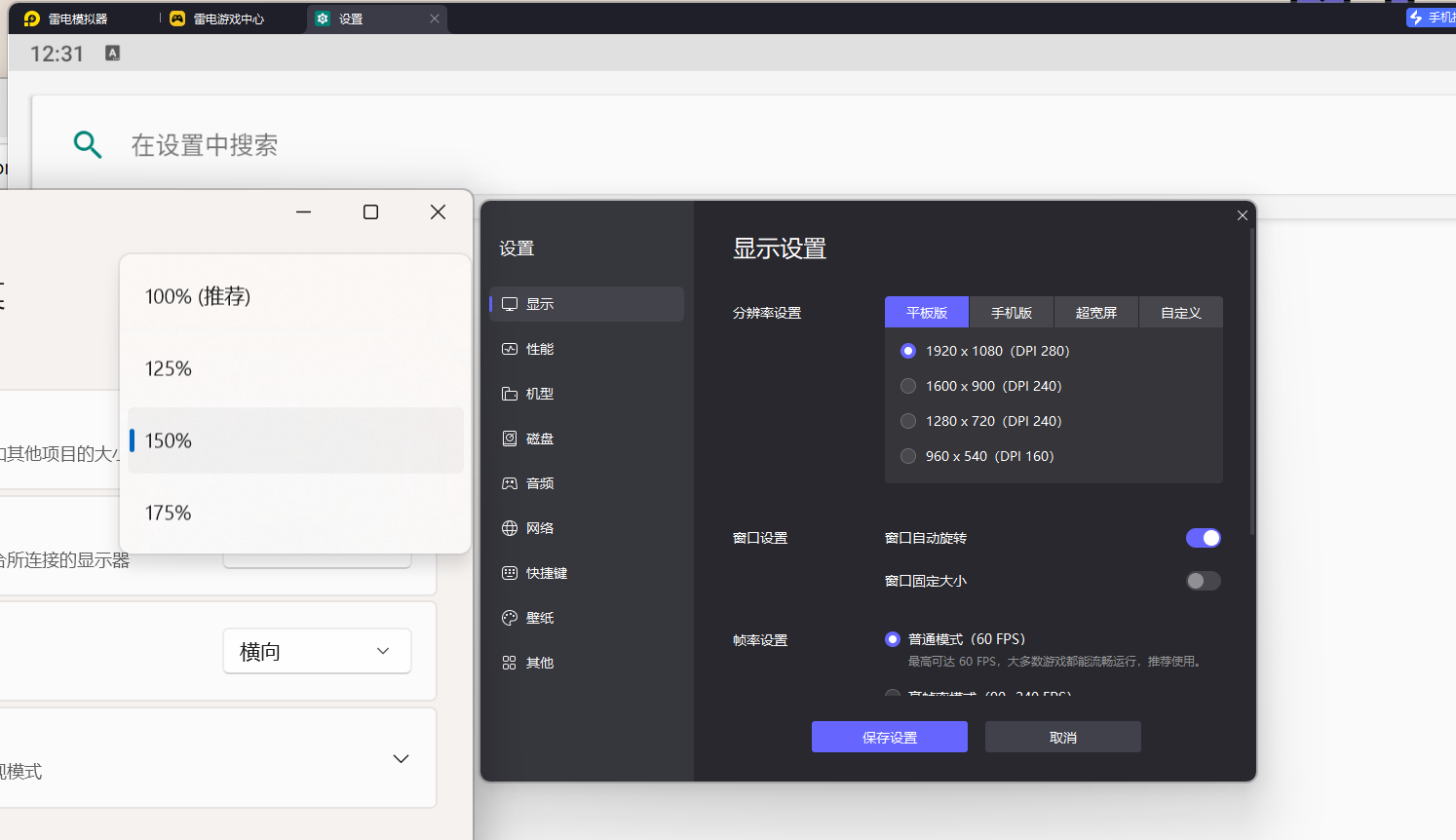 2)模拟器窗口缩放100%不是自定义显示缩放150%,不随缩放改变布局;