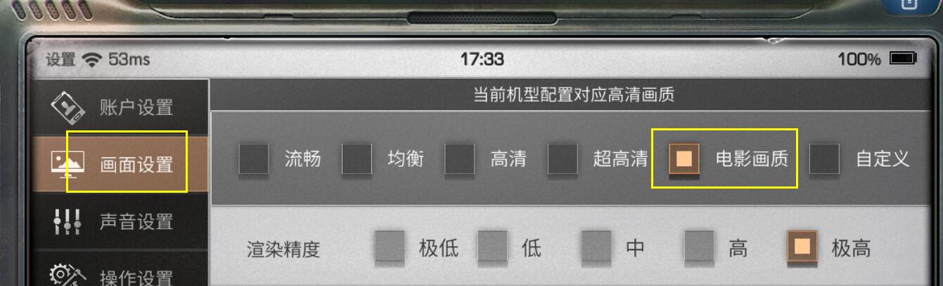 2.游戏设置:游戏内设置:操作方式选择第二个、高帧率、电影画质。(电脑配置低的用户建议用流畅的画质)