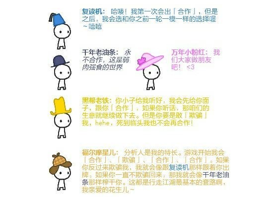 福尔摩星:前四轮固定顺序为①合作②欺骗③合作④合作重点是若你在前四轮一直选择合作,那他之后几轮会一直欺骗你 若你在前四轮有欺骗行为,第五轮开始,福尔摩星的行为将模仿复读鸡 对抗轮数:七轮