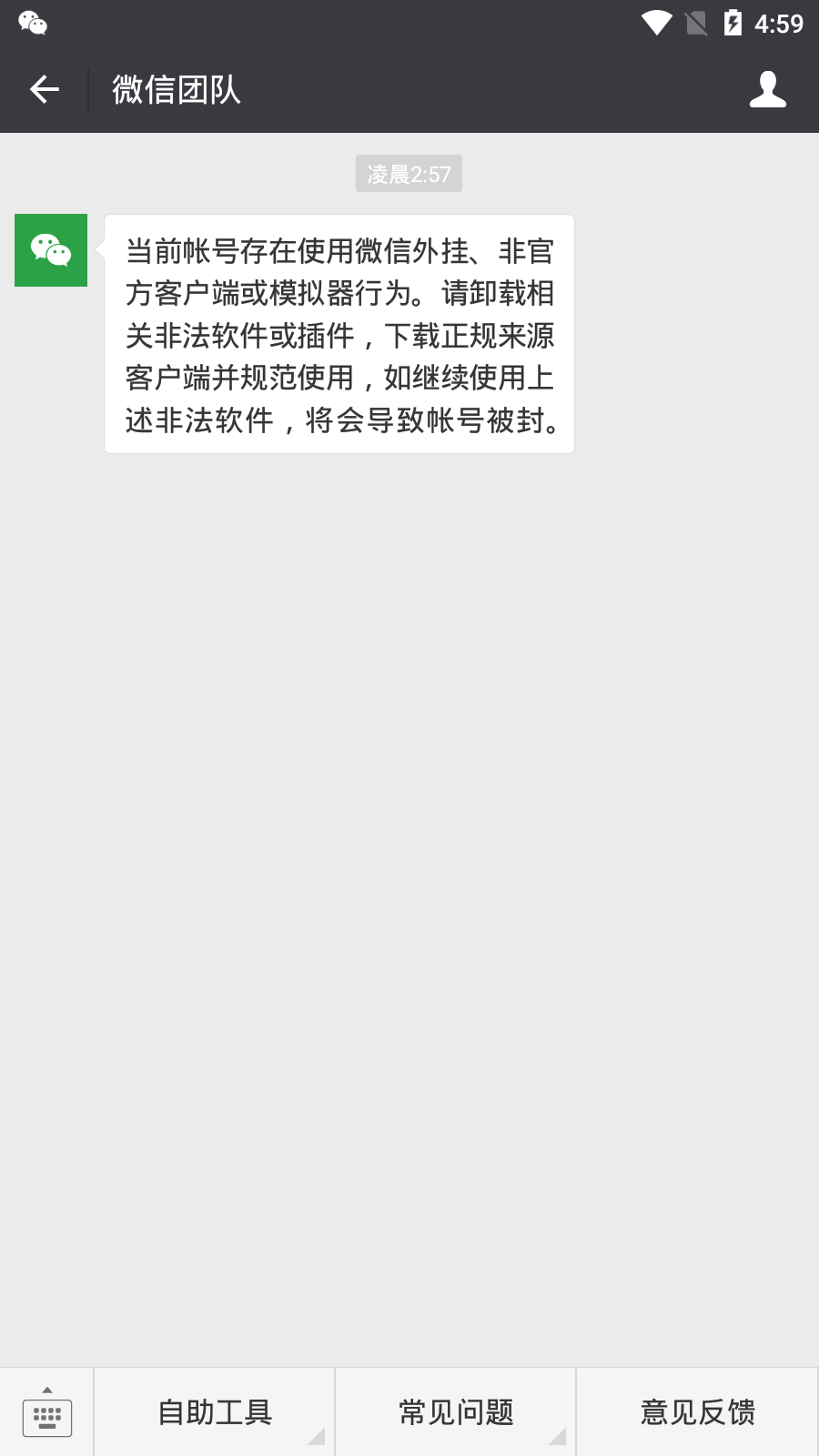 当前帐号存在使用微信外挂、非官方客户端或模拟器行为。请卸载相关非法软件或插件,下载正规来源客户端并规范使用,如继续使用上述非法软件,将会导致帐号被封。