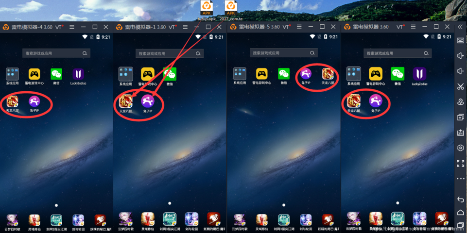 首先把模拟器安装多开好窗口,然后在每个模拟器中安装一个兔子-IP-工具(浏览器搜索找到),下载安卓手机版的兔子文件,然后用鼠标拖入模拟器你中安装就可以了。
