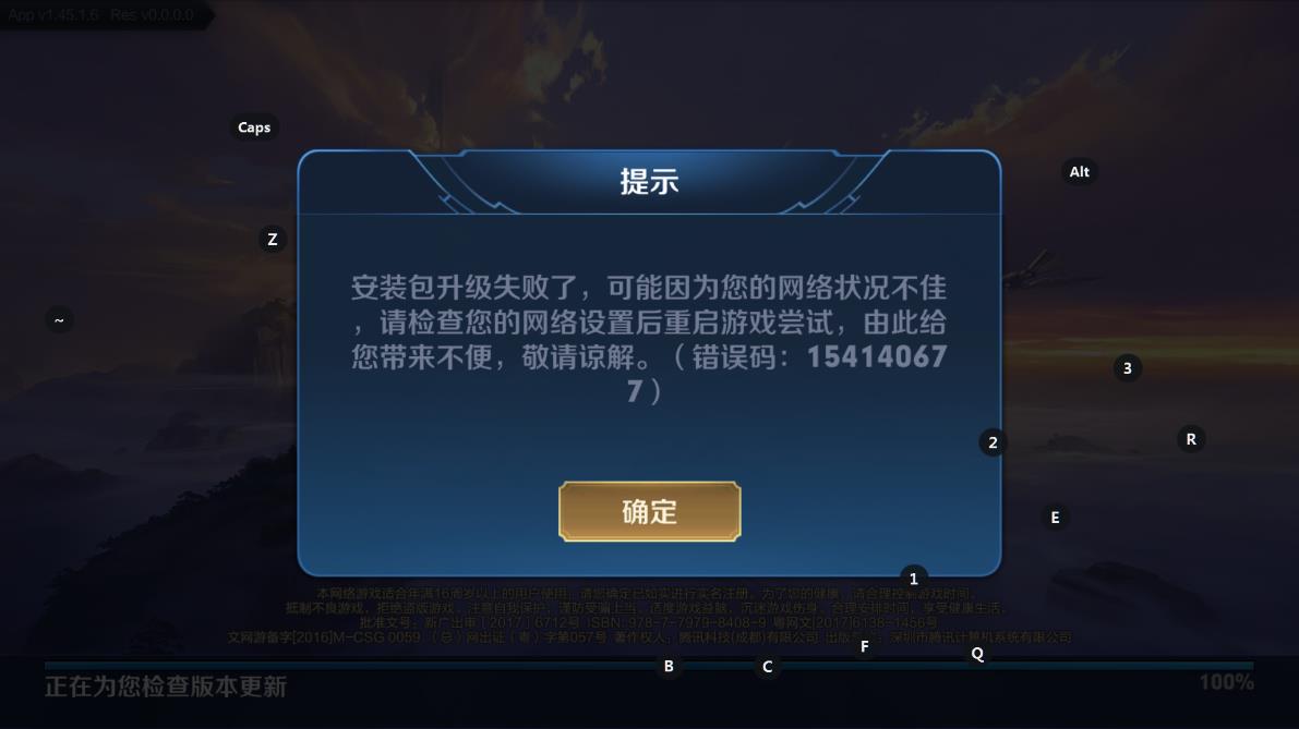 更新到最新版本后,就会出现“安装包升级失败,可能是网络不佳,重新启动游戏尝试,,错误码:154140677”,网络肯定保证没有问题,上回有一次升级过后,也出现过这种情况 ,我忘了是怎么弄的,,这次,我尝试了,重新下载游戏,重新雷电客户端,重新降级到3.64,,都没办法解决,所以才请教大神们,希望,能给于解决,在线等,谢谢