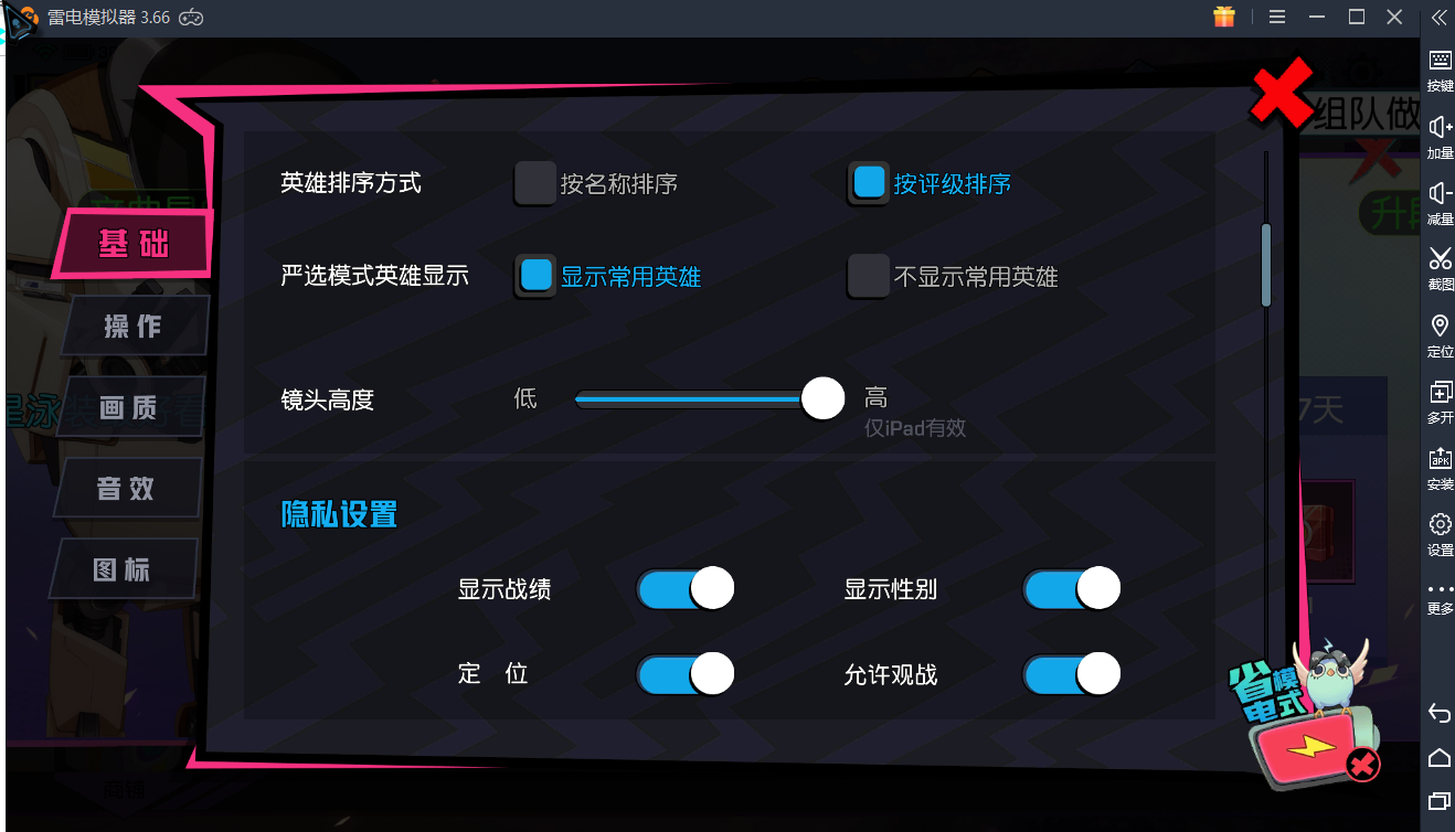 雷电模拟器可以被王者荣耀、决战平安京、非人学园等moba游戏识别成ipad设备,然后就可以设置最高的视角,这样玩舒服了。