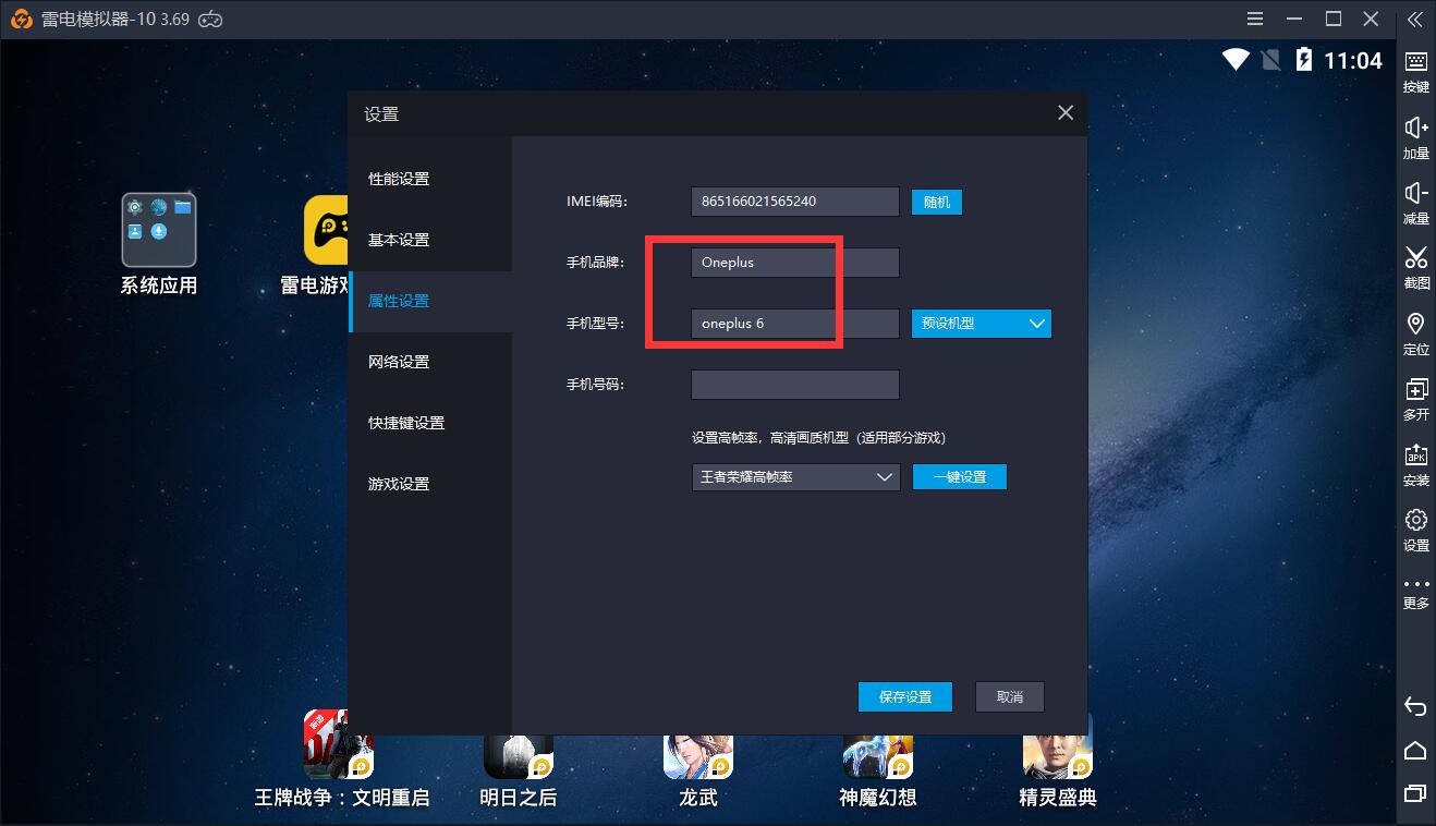 首先打开模拟器右边的设置,打开属性设置,然后设置 手机品牌:Oneplus 、手机型号:oneplus 6