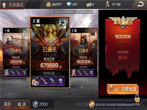 对于生存模式的基本每日上限奖励:生存模式第一层每日福利上限为120000金币1600生存币此后每通关一层(每层15个关卡)增加60000金币,生存币增加800生存币,可获取碎都是100没什么改变;在进入关卡前可以用钻石以及金币购买增益道具,用钻石购买的增益道具为冲刺关卡,如果当前已经通关了第一层的15关购买了这个道具的时候就会冲刺9关从第十关开始打怪(目前测试版本是很少钻石考虑到公测时差距就不说多少钻了),购买的好处就是能冲刺关卡冲刺完毕手动退出直接可以获取相应的金币,生存币以及碎片奖励;