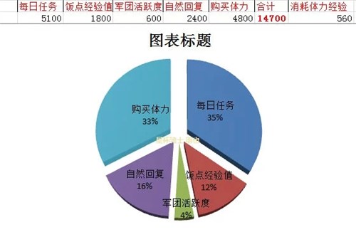 以上就是全部的经验来源,最免费的就是每日任务,因此每日任务尽量全部完成,在完成每日任务的同时工会的100活跃度也能轻易完成60点体力等于白送,午餐和晚餐180点体力也是白送,加上自然回复的体力240;一天白送的体力480点共4800点经验值+每日任务5100经验值合计9900经验值,再加上购买的体力4800经验值一共是14700经验值。减去日平均消耗的380点经验值;