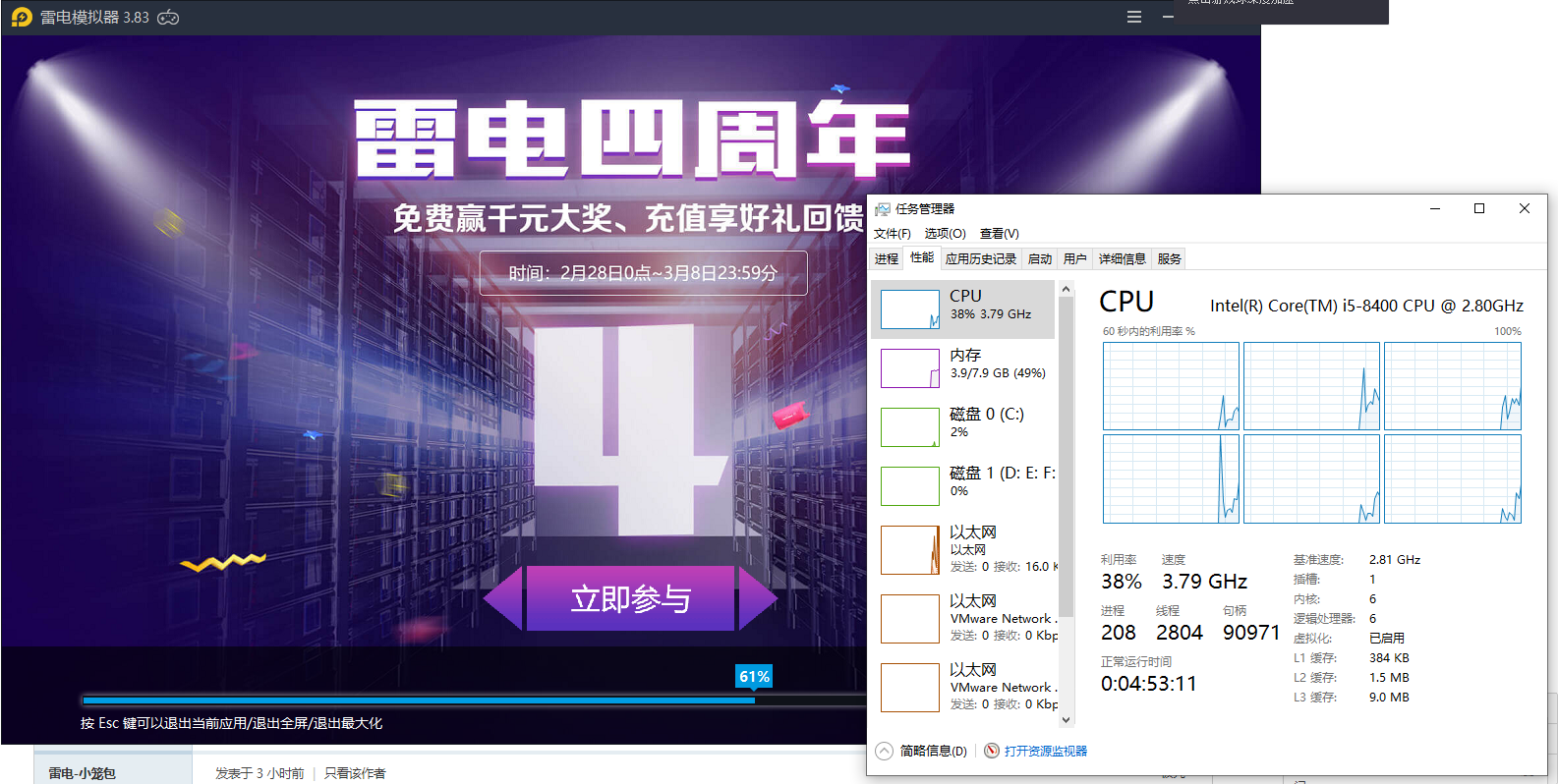• 临时用公司的电脑截两张图吧,有问题的是家里那台,可以的话我晚上在截个图给你看看。 1、我不知道你说的100%正常是指什么时候,模式器启动?游戏的时候?那可能是我没说清楚,一打开模拟器就100%占用而且是长时间的,如果只是瞬间100%我不会来发这个帖子,我可以理解;况且还没出现这个问题前模拟器启动基本都是5、6秒就进到桌面里了,处理器使用率封顶基本也就是50%~60%,100%说实话我是头一回见;而且,我不是多开啊,大哥。 2、我也说了任务管理器上显示100%的原因是因为这个进程,我没说就是因为这个原因。我现在更想搞清楚的是到底为啥会突然莫名其妙的跟我的浏览器有这种奇怪的冲突。
