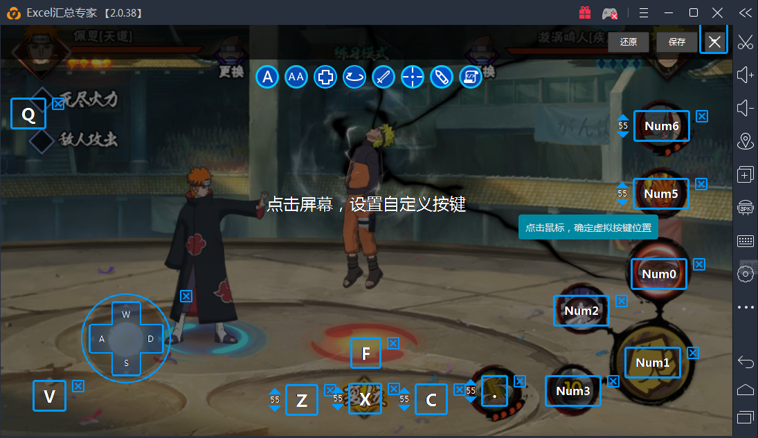 这是我火影忍者手游的键盘按键设置, 游戏本身不能连发的键位都设置了连发按钮, 55次/秒除了连发抢先手外,刚好也适合点按发动,不会点按无反应。 zxcv是积分赛的按钮,连发非常好用。