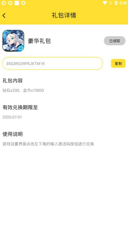 2、进入礼包详情页面查看礼包详情、复制礼包码。