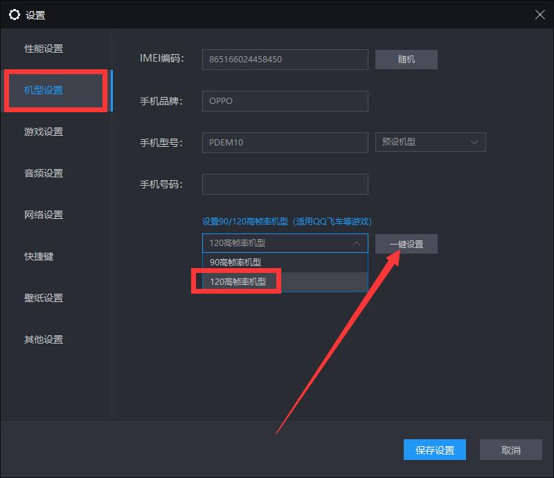 步骤2:在设置界面中继续点击机型设置——选中120帧率机型——点击一键设置