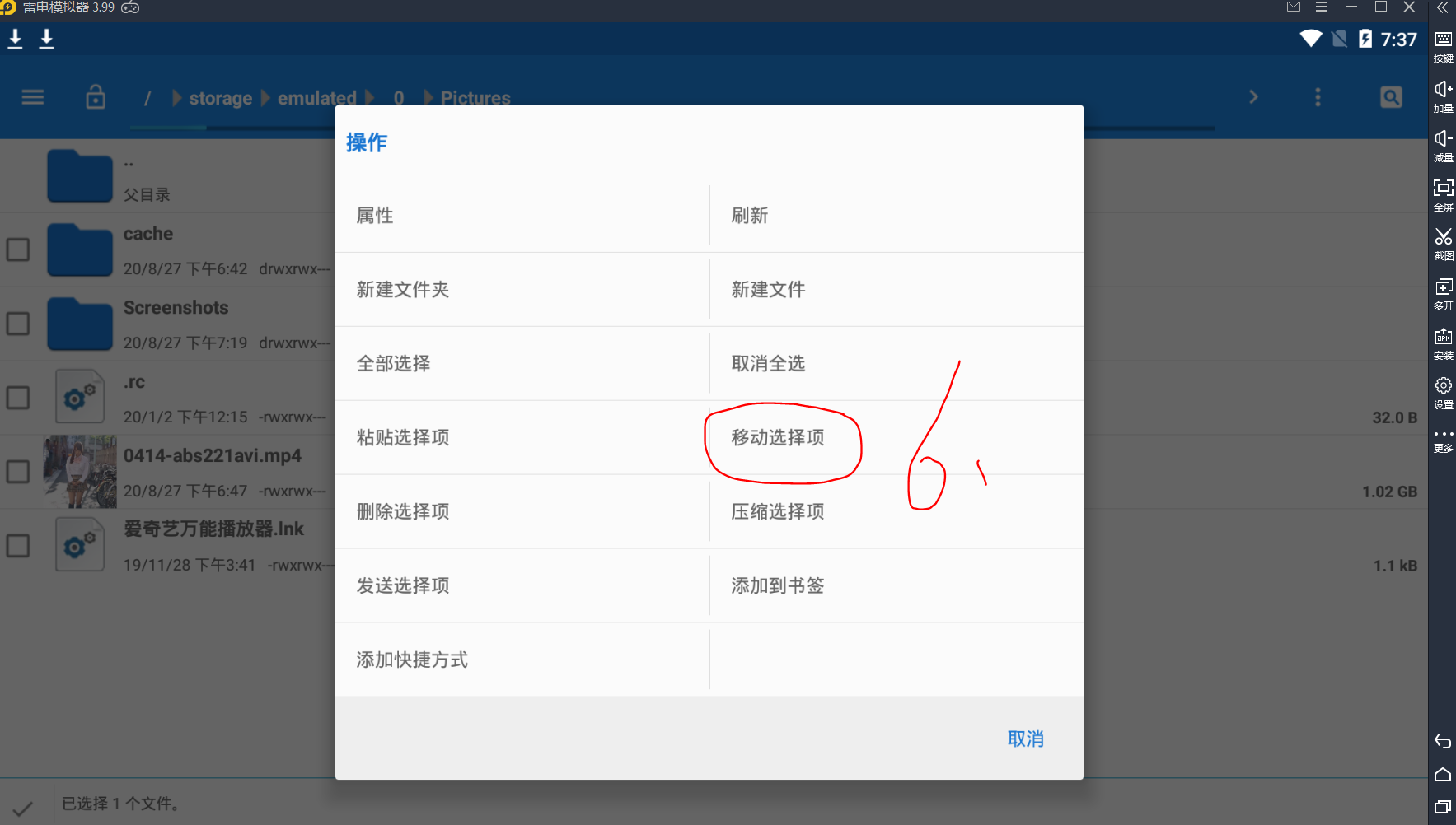 然后看下面的步骤,1,勾选你要移动,或者复制到电脑上的文件,2,点击菜单键