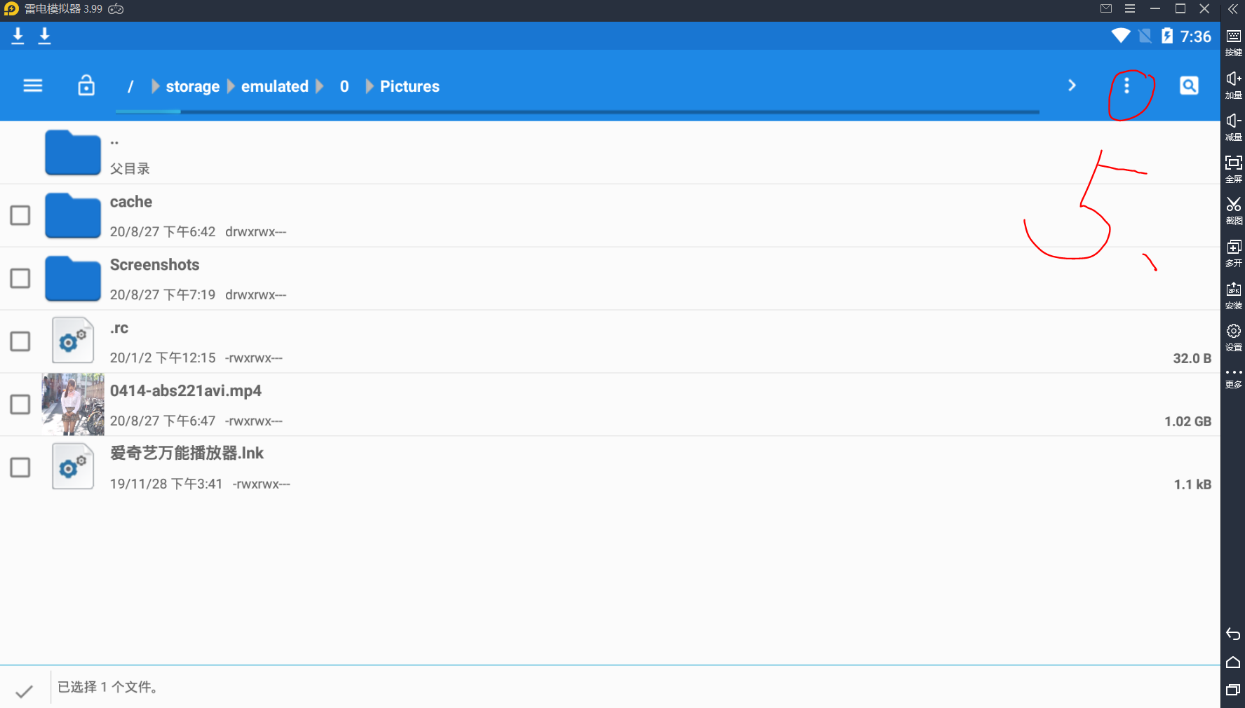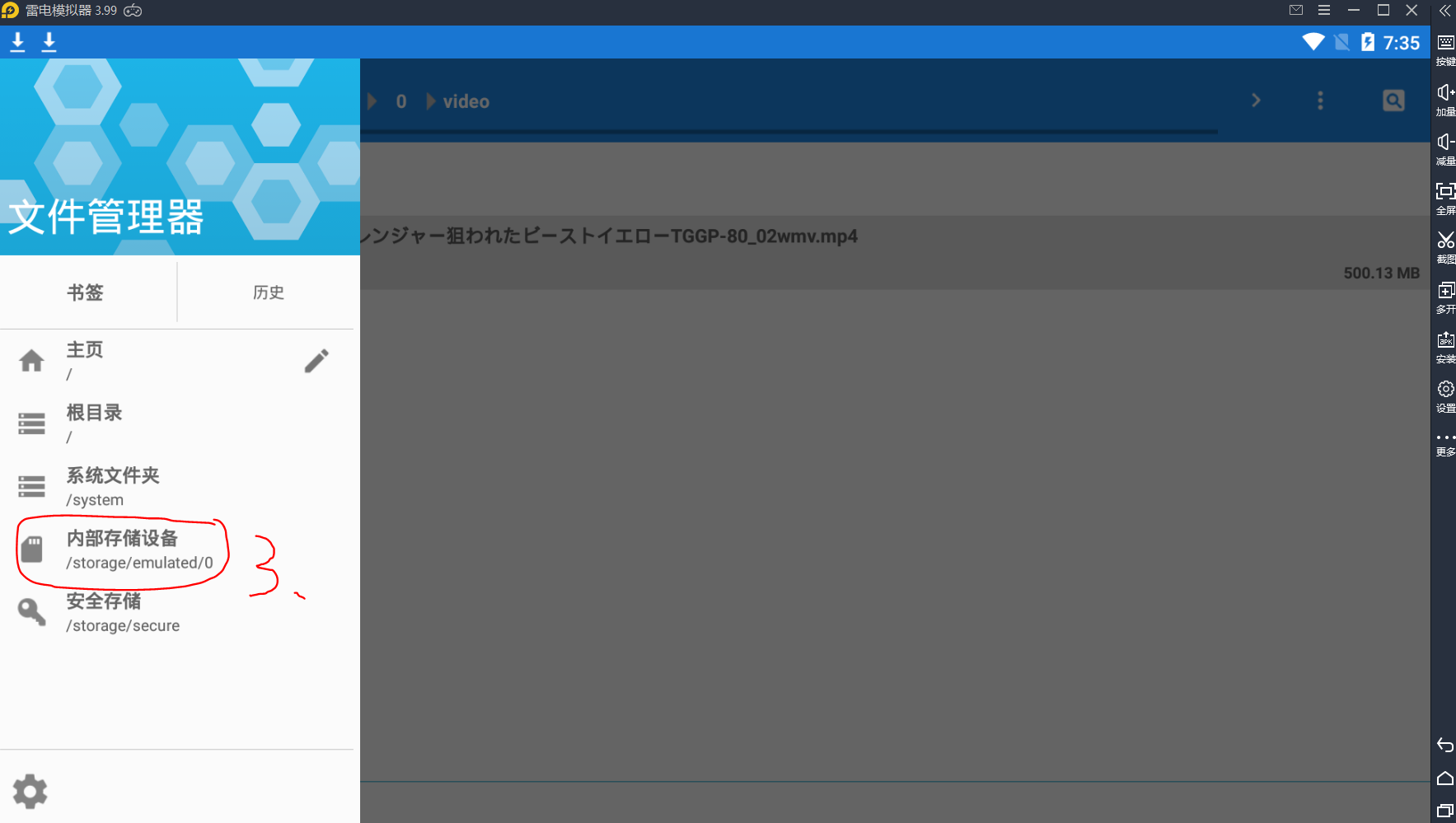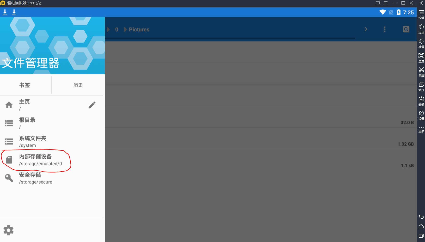 首先,在雷电桌面找到 文件管理器,点击打开内部存储设备