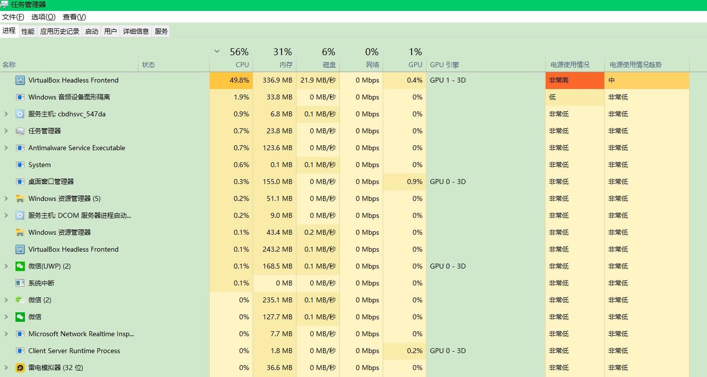 我安装的是32位的雷电模拟器4.0.33版本,为什么开一个模拟器时,任务管理器中显示LdVBoxHeadless Frontend 占用CPU高达百分之四十几,开两个模拟器时,任务管理器中显示LdVBoxHeadless Frontend 占用CPU高达百分之8十几,导致模拟器卡死不动了,请问这是为什么?是我的电脑配置造成的吗?好像不是电脑配置造成的,因为以前装过以前版本的雷电模拟器,多开几个都没有出现现在这种CPU占用高的情况。没有出现卡顿卡死不动的情况。不知道为何现在重新了系统,换了较新版本的CPU竟然这么高的CPU占比了!请教一下如何才能在保证开两个或三个模拟器时,让CPU不那么高?