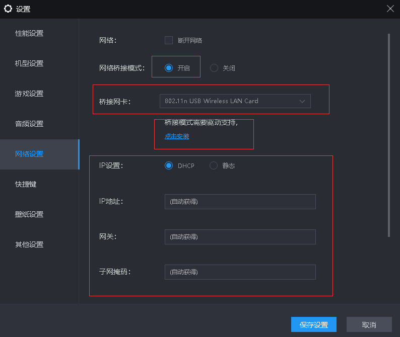 输入IP地址,网关,重启模拟器。例子如图:特别注意:设置的IP不能有冲突,否则桥接没有效果。
