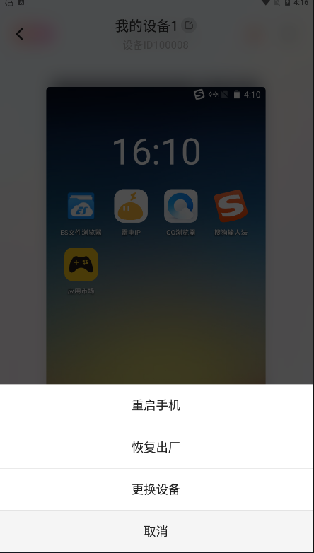 2、云手机界面点击管理按钮,可以显示当前云手机的操作菜单栏,支持重启、更换设备等操作
