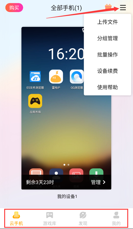 3、点击云手机右边三条杠,可以看见上传文件、分组管理、批量操作等功能