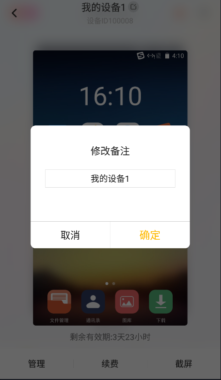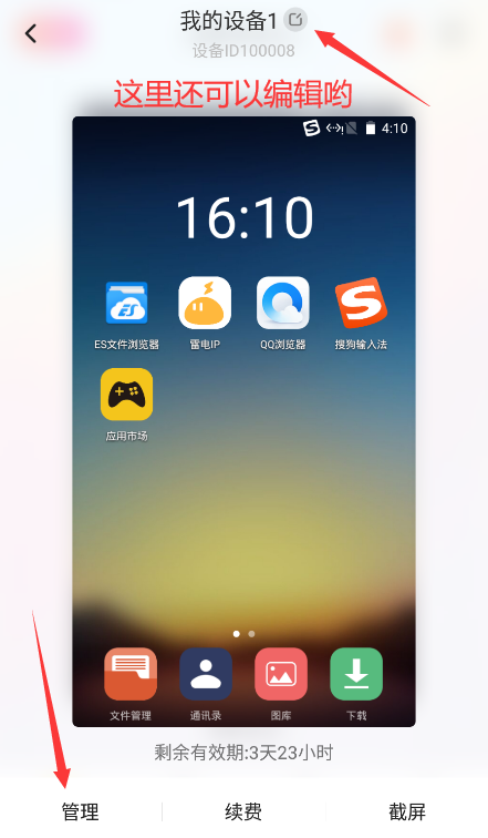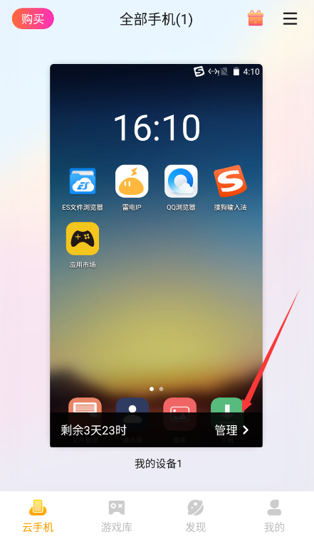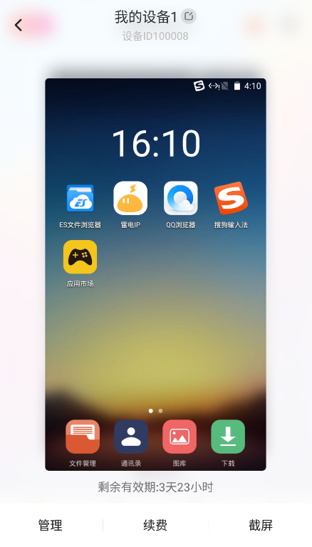 1、在云手机预览界面点击管理按钮可以显示当前云手机的管理、续费、截屏等操作。