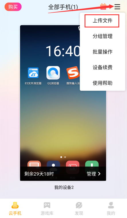 在云手机预览界面左上角点击三条杠,会出现“文件上传”点击文件上传(如图1)