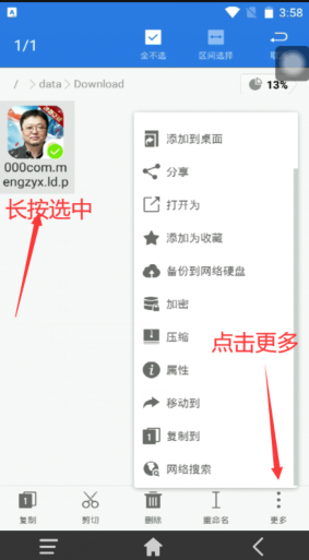 1.长按图片2s,直到下方出现工具栏,点击更多