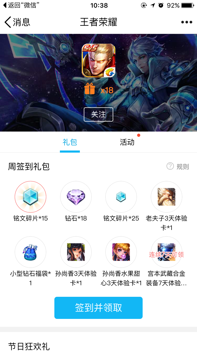 3、点击“领王者微信礼包”会跳转到微信领取页面。
