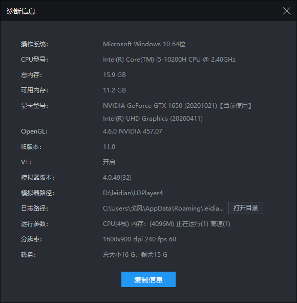 假如我们下载的雷电模拟器路径在D盘,那它上面APP所用的内存即D盘是吧? 诊断的总内存和可用内存指的是啥,,,这个地方不能调大吗?还是占用CPU啊