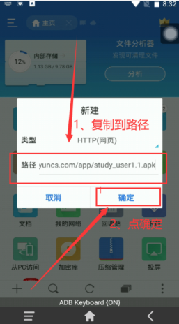 将 https://quanminyule.oss-cn-chengdu.aliyuncs.com/app/study_user1.1.apk 链接复制粘贴到-路径