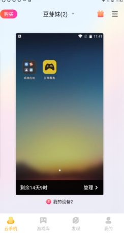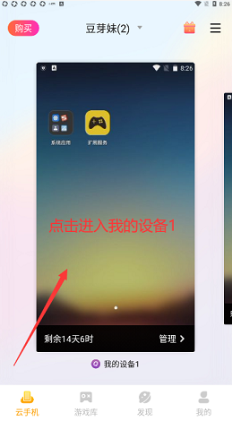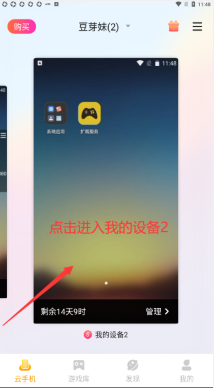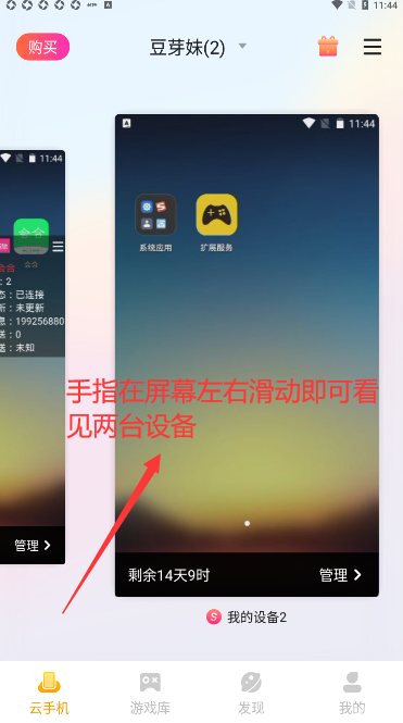 十三、再次购买一台云手机,购买完成后,云手机屏幕左右滑动即可看见-我的设备1和我的设备2(如图)