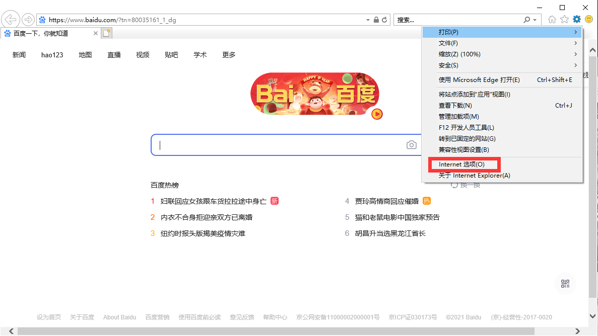 1、找到电脑自带的ie浏览器,点击右上方设置,打开“Internet选项”
