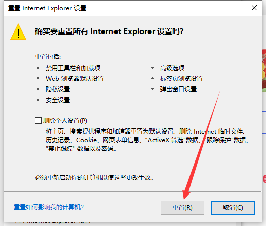 2、选中“高级”选项,点击下方“重置”,弹出窗口后继续点击“重置”