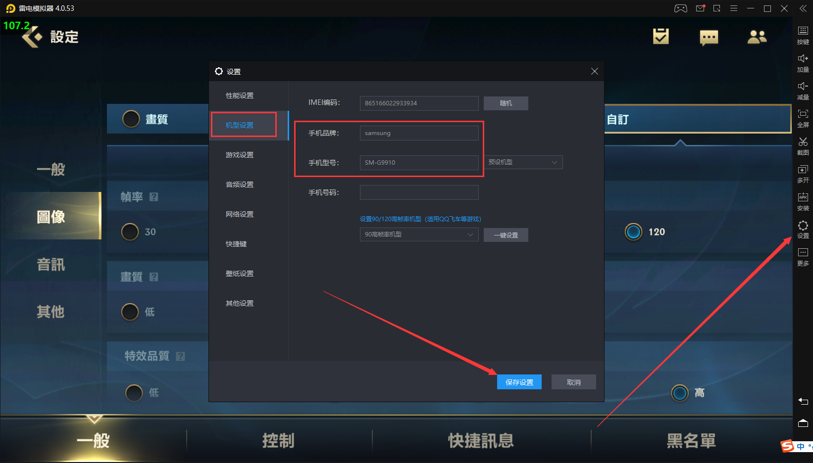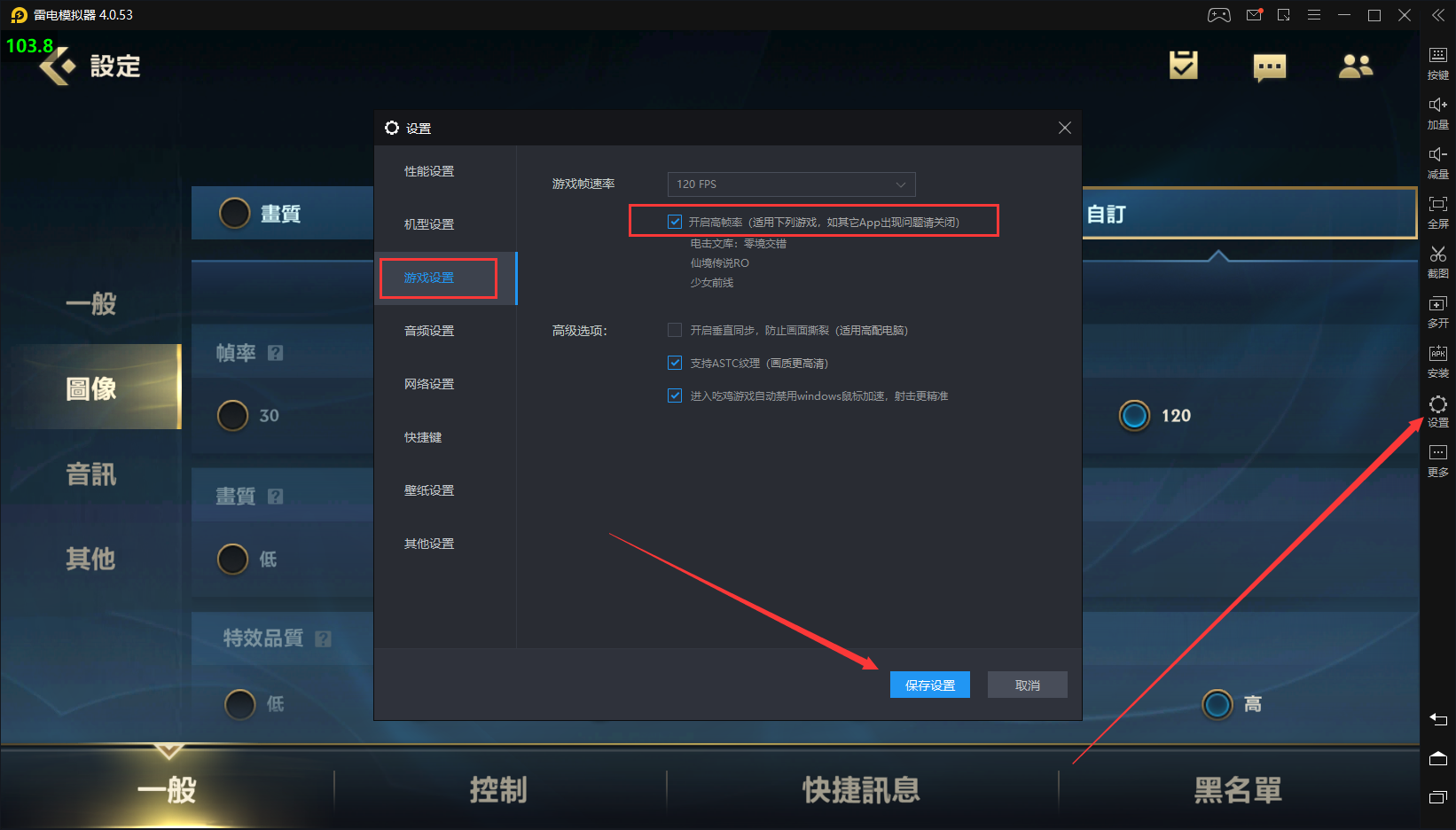 (2)找到“游戏设置”找到开启高帧率选项打勾,再点击下面保存设置后,重启模拟器,打开游戏,找到图像设置,选择自义定布局,开启120帧率