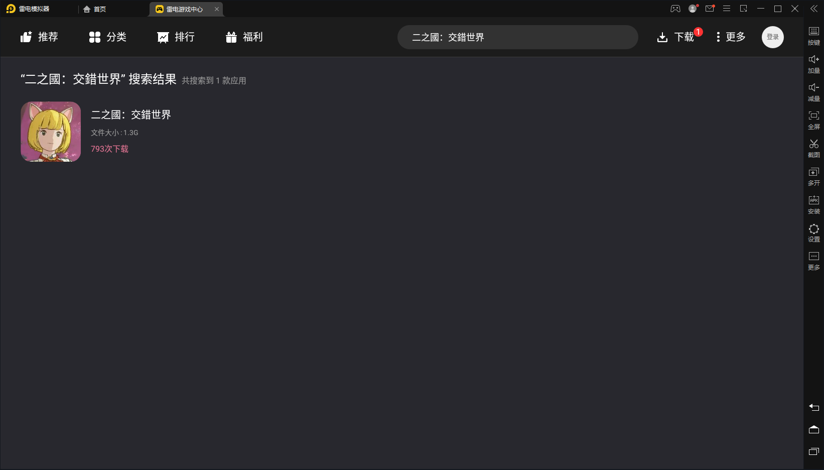 进入雷电游戏中心,搜索《二之国交错世界》下载安装。(加速器优选奇游加速器)