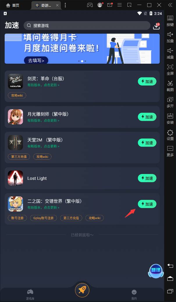 4、打开加速器,选择安装好的《二之国交错世界》加速就好,不要在加速器里面更新包体,避免出现闪退情况。