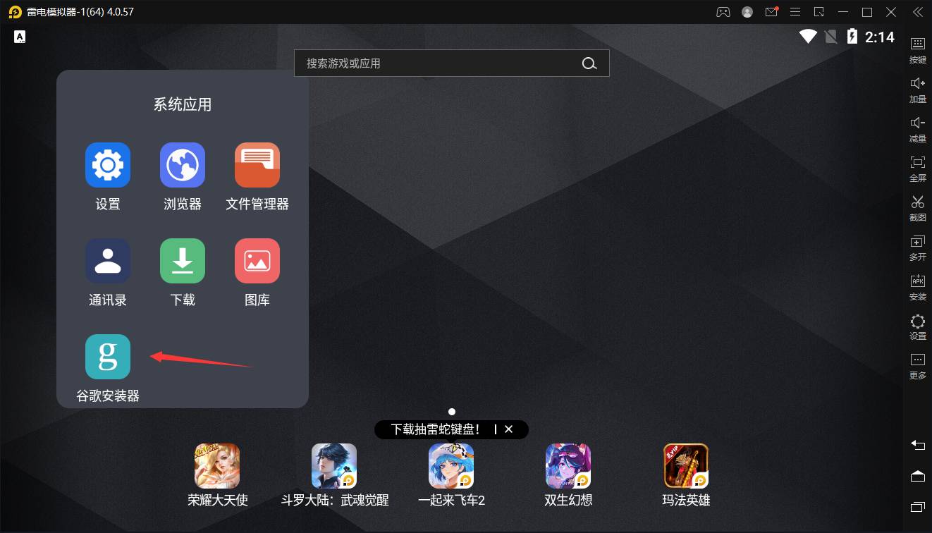 3、返回模拟器桌面,打开系统应用安装谷歌套件。(如果没有谷歌账号,打开加速器进入加速模块就有账号注册教程)