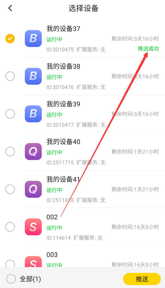 3.选择设备,然后点击推送,然后等待推送成功即可。