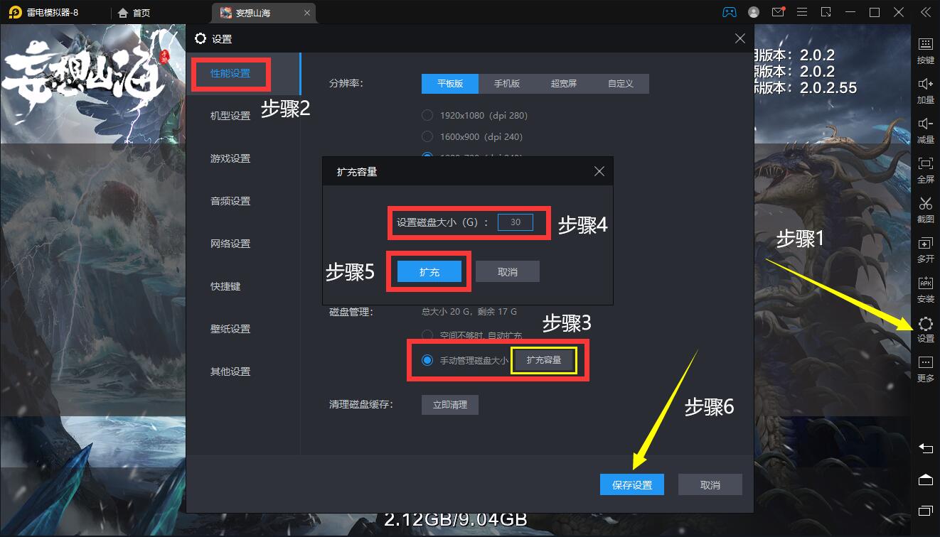 打开模拟器右侧设置——性能设置——点击手动管理磁盘大小扩充容量——把数值变更为30——点击扩充——最后保存设置即可