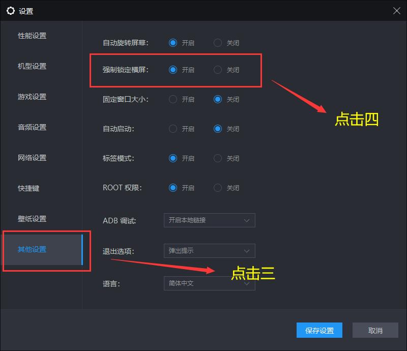 2,然后点击左侧"更多设置",找到强制横屏开关,选择开启状态,如图: