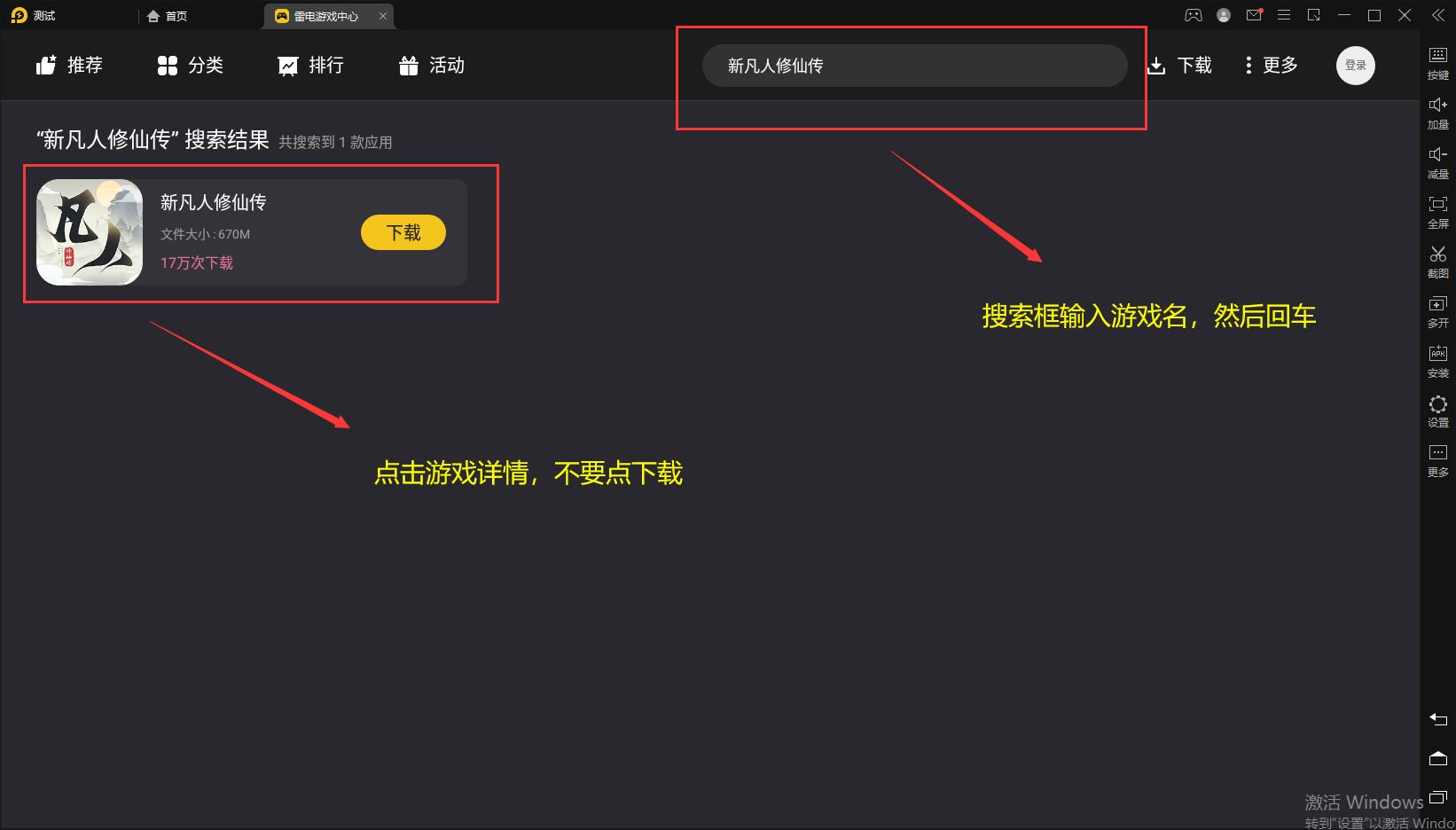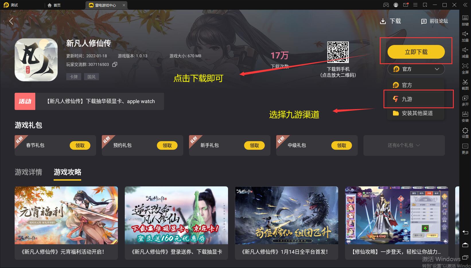 4,安装完成后我们打开模拟器桌面上的游戏中心,然后搜索《新凡人修仙传》,选择九游渠道,下载游戏即可,如图:
