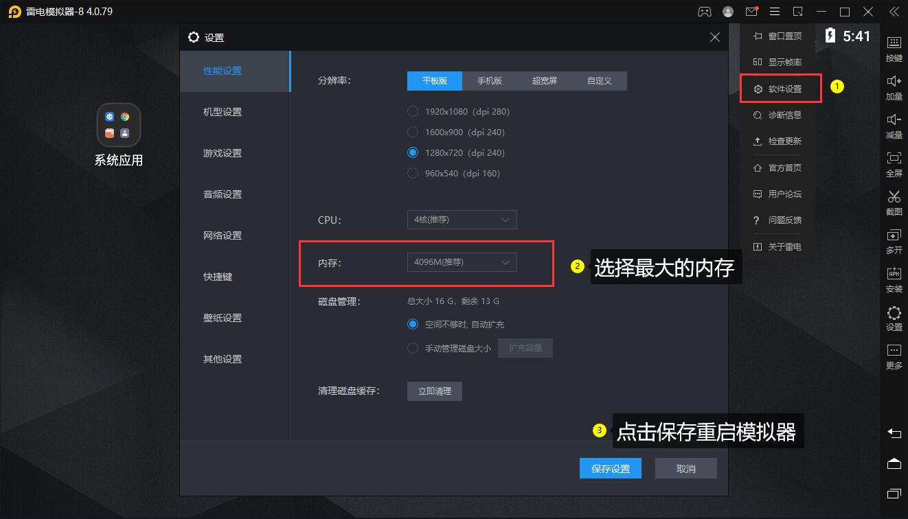 1,打开模拟器右上角设置,然后选择软件设置,在性能设置界面,将内存选项修改成最高内存(最高内存视配置而定),然后保存重启模拟器,我们正在查看修复此问题。如图: